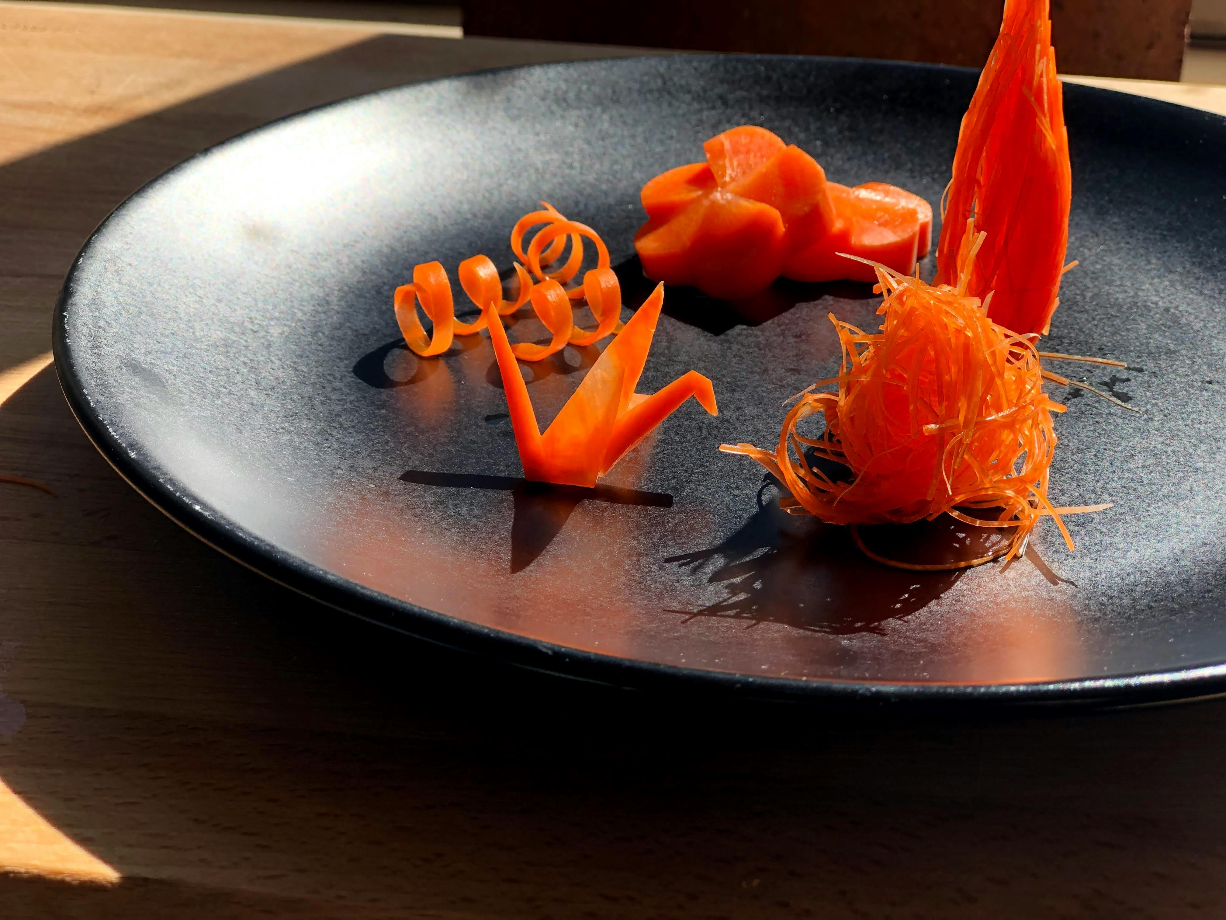 “When I feel stuck, I start slicing vegetables without a plan – just letting my hands move. Sometimes inspiration comes from the rhythm of the knife or the unexpected shape that appears as I carve. I also look to traditional Japanese garnish techniques or seasonal ingredients for new ideas.”