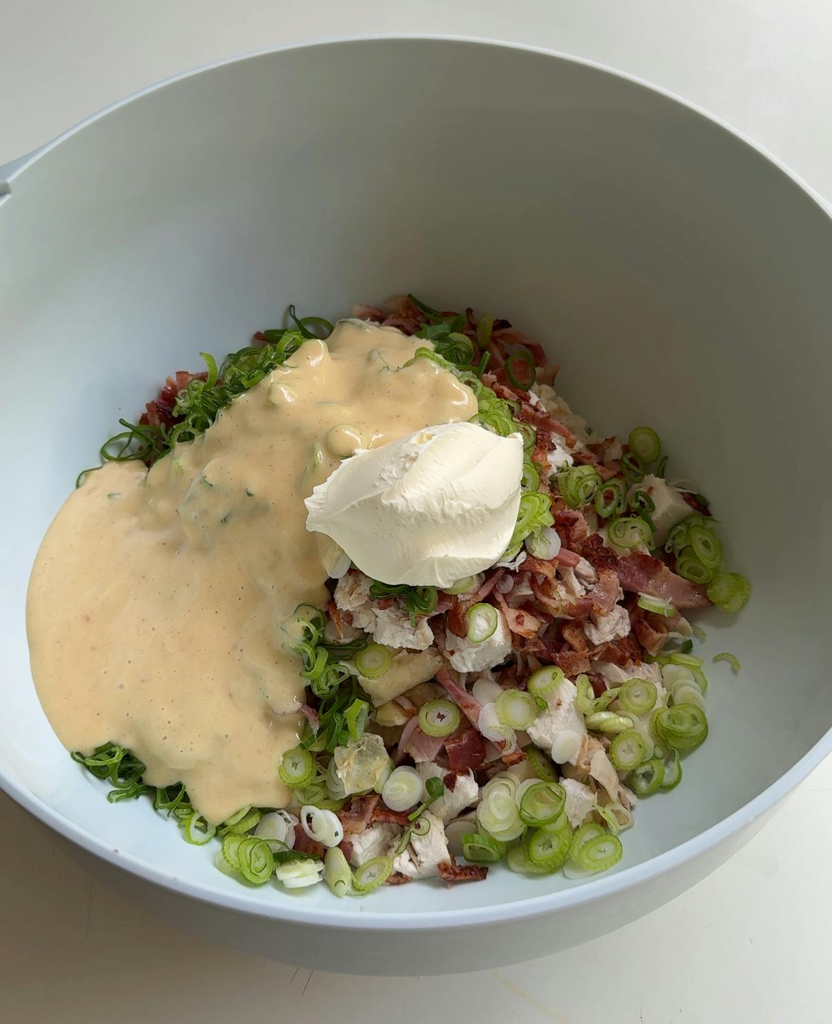Place mayonnaise in a bowl and slowly whisk in chicken roasting juices. Add chopped chicken, bacon, spring onions and sour cream. Add a pinch of salt and a grind of black pepper, and then a small squeeze of lemon juice and mix well.