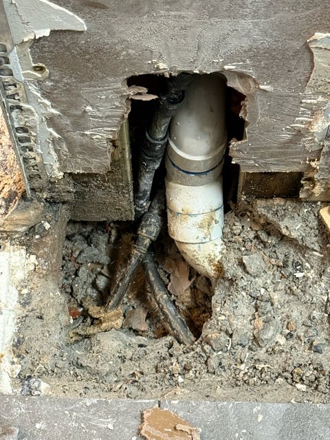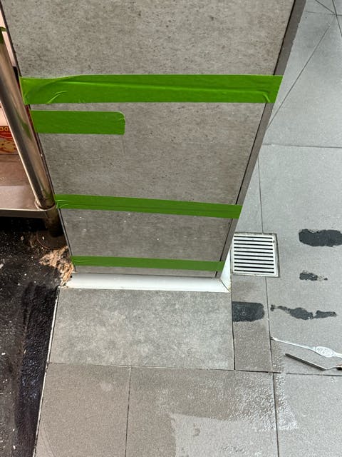 Find an Ian. Our Ian is a great plumber. Alongside your Ian, carefully locate the pipe and fix it. Cement, tiles and grout follow and, to me, are the same as cake, filling and icing. Spend a week telling the team, “Boy, that is some pro level tiling right there.” The sun is warm on your face, enjoy it.