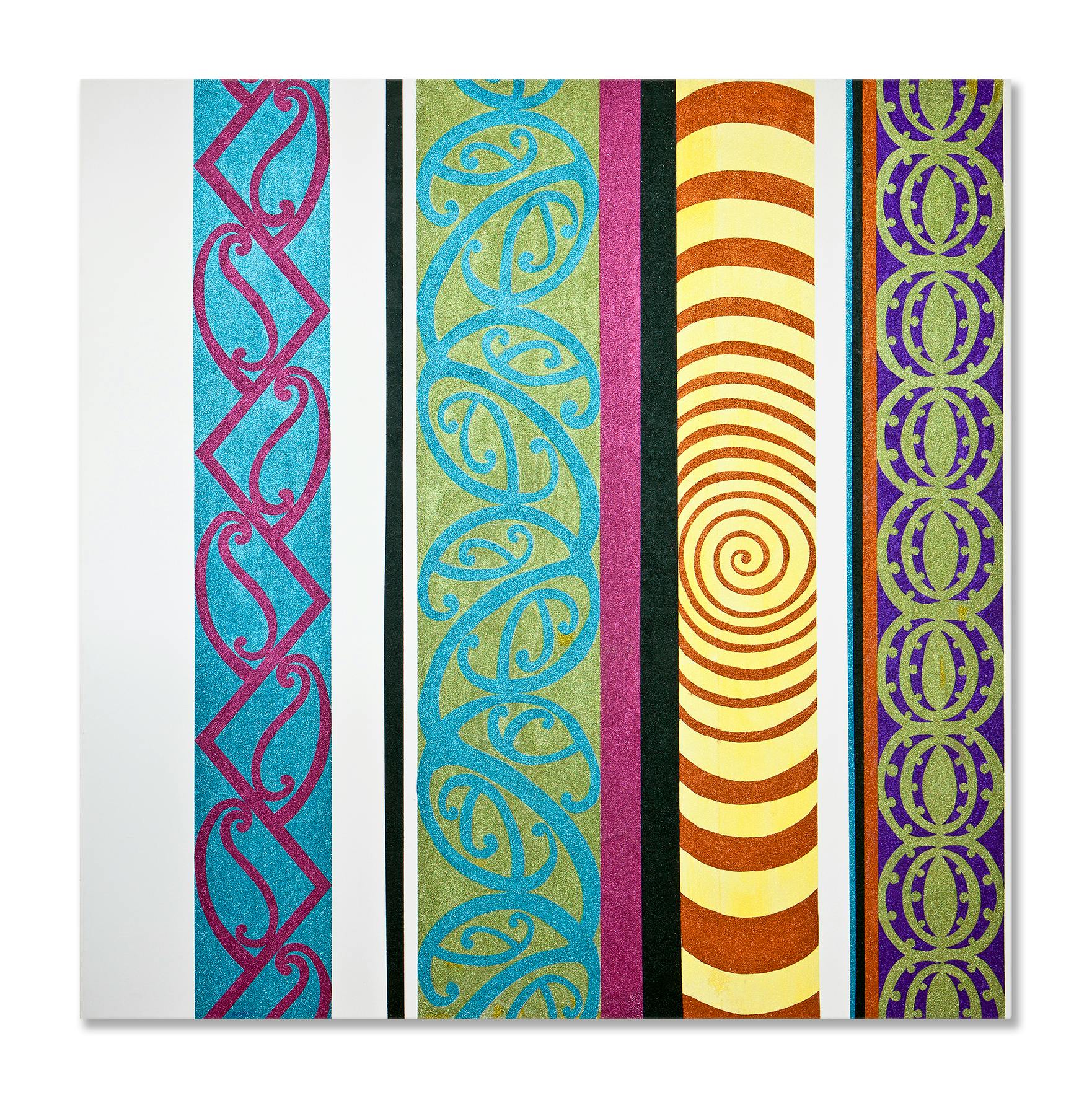 The Wharenui That Dad Built (2000) will always sit at the centre of my practice. I made it not only as a celebration of my father, but as a mihi [thank you] to him, a way of placing his presence on a gallery wall. Over time, the work has grown with him and with me. It was also a turning point in my making. It was the first time I achieved a perfectly hard edge using a material as unruly as glitter, a moment where control and chaos finally aligned. That discovery felt like the beginning of my visual language.