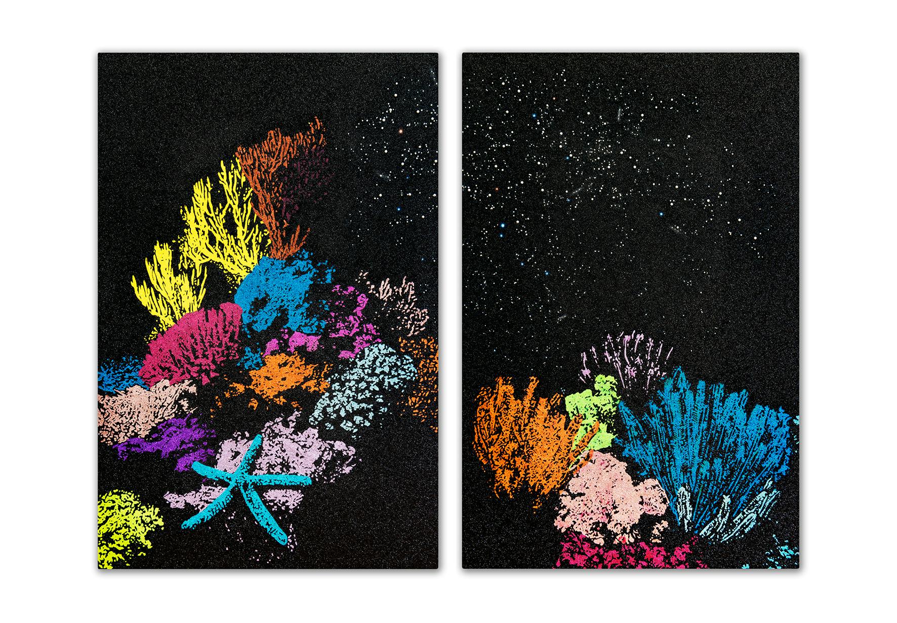 Bethlehem (Constellation Orion), 2024, glitter, Japanese fresh water pearls, acrylic and mixed media on canvas, each panel 1524 x 1016 x 50 mm. Photograph by Henry Hargreaves.