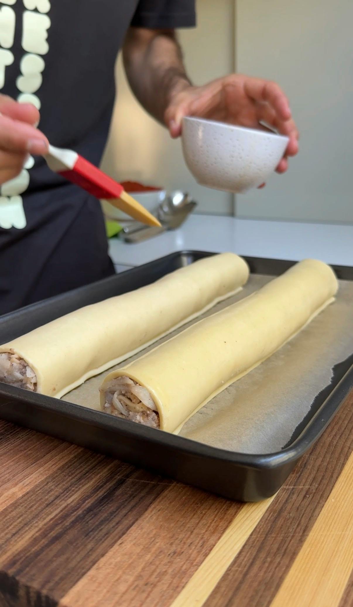 Measure 15cm wide strips of puff pastry, place potato filling in the middle (I like to use a large piping bag) and brush with a small amount of egg wash to seal.